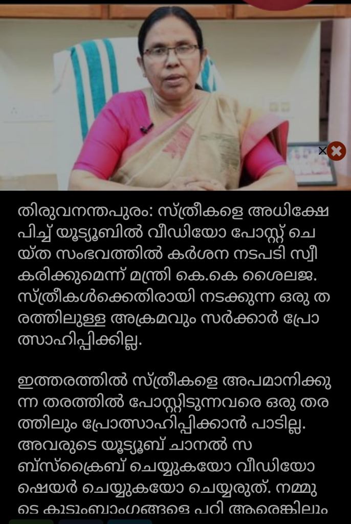 നന്ദിയുണ്ട്, ഇപ്പോഴെങ്കിലും സംസാരിച്ചതിന്. നിങ്ങൾക്കറിയുമോ എന്നറിയില്ല, കേരളത്തിൽ കന്യാസ്ത്രീകളെന്ന് അറിയപ്പെടുന്ന, സ്ത്രീവർഗത്തിൽപ്പെട്ട കുറേ ജന്മങ്ങൾ ജീവിച്ചിരിപ്പുണ്ട്. അവരുവഴി നിങ്ങൾ സർക്കാർ സംരക്ഷിക്കേണ്ട കുറേ ദുർബലജന്മങ്ങൾ സ്വസ്ഥമായി ജീവിക്കുന്നുമുണ്ട്. എന്നാൽ കഴിഞ്ഞ കുറേ നാളുകളായി പലതിന്റെയും പേരിൽ ആ നിർദോഷരായ സഹോദരിമാരെയും അവരുടെ സമൂഹത്തെയും മാത്രമല്ല, അവരുടെ മാതാപിതാക്കളെപ്പോലും കേട്ടാലറയ്ക്കുന്ന അശ്ലീലംകൊണ്ടു മൂടുന്ന കുറേ ഞരമ്പുരോഗികളെകൊണ്ട് സാമൂഹ്യമാധ്യമങ്ങൾ നിറഞ്ഞിരിക്കുകയാണ്. നൂറുകണക്കിന് പരാതികൾ നിങ്ങളുടെ നിയമപാലകർക്ക് അതേക്കുറിച്ച് ലഭിച്ചിട്ടുമുണ്ട്. പക്ഷെ ഇവിടുത്തെ സ്ത്രീസംരക്ഷകരോ നിയമമോ ഒന്നും ഇതുവരെയും ആ നിലവിളികൾക്കുമുമ്പിൽ ചെവി തുറന്നിട്ടില്ല. എന്തിനേറെ, തന്നെക്കുറിച്ച് അശ്ലീലം കേട്ടപ്പോൾ നിയന്ത്രണംവിട്ടു നിയമം കൈയിലെടുത്ത ആ ബഹുമാന്യ സ്ത്രീസംരക്ഷക പോലും കമാന്നൊരക്ഷരം അതിനെക്കുറിച്ചു മിണ്ടിയിട്ടില്ല.